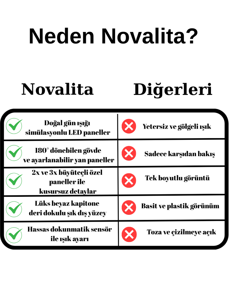 Sol panelde yer alan 3X ve 5X büyüteçli aynalar sayesinde eyeliner çekmek veya kaş şekillendirmek gibi en hassas işlemleri hata payı bırakmadan gerçekleştirebilirsiniz.