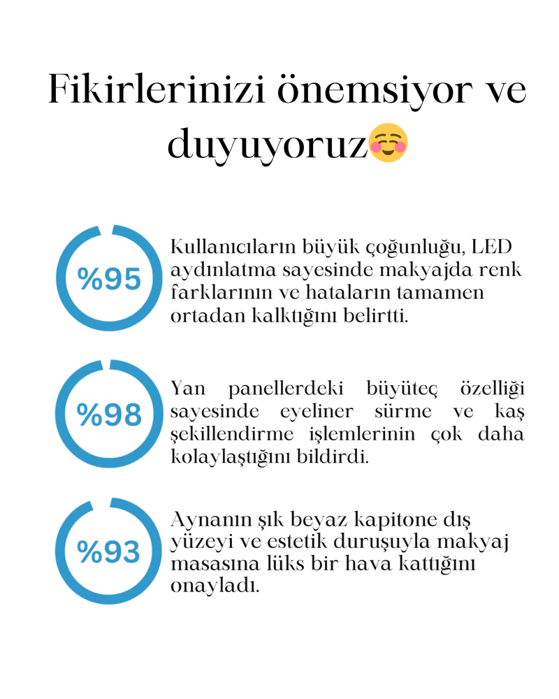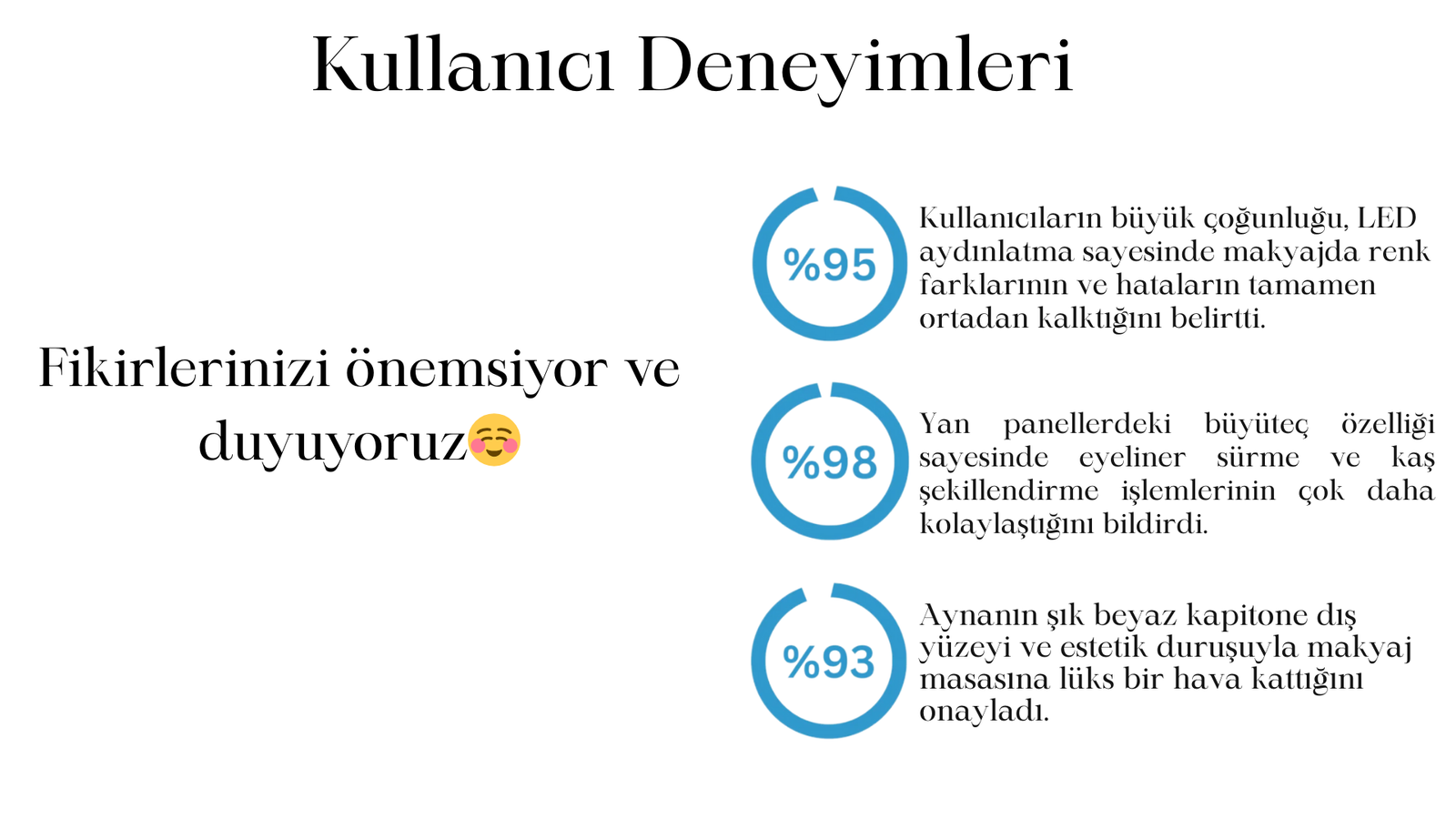 Günlük bakım rutinini lüks bir güzellik ritüeline dönüştür. Gözü yormayan yumuşak ışığı eşliğinde hazırlanırken kendini şımart, güne aydınlık ve özgüvenli bir başlangıç yap.