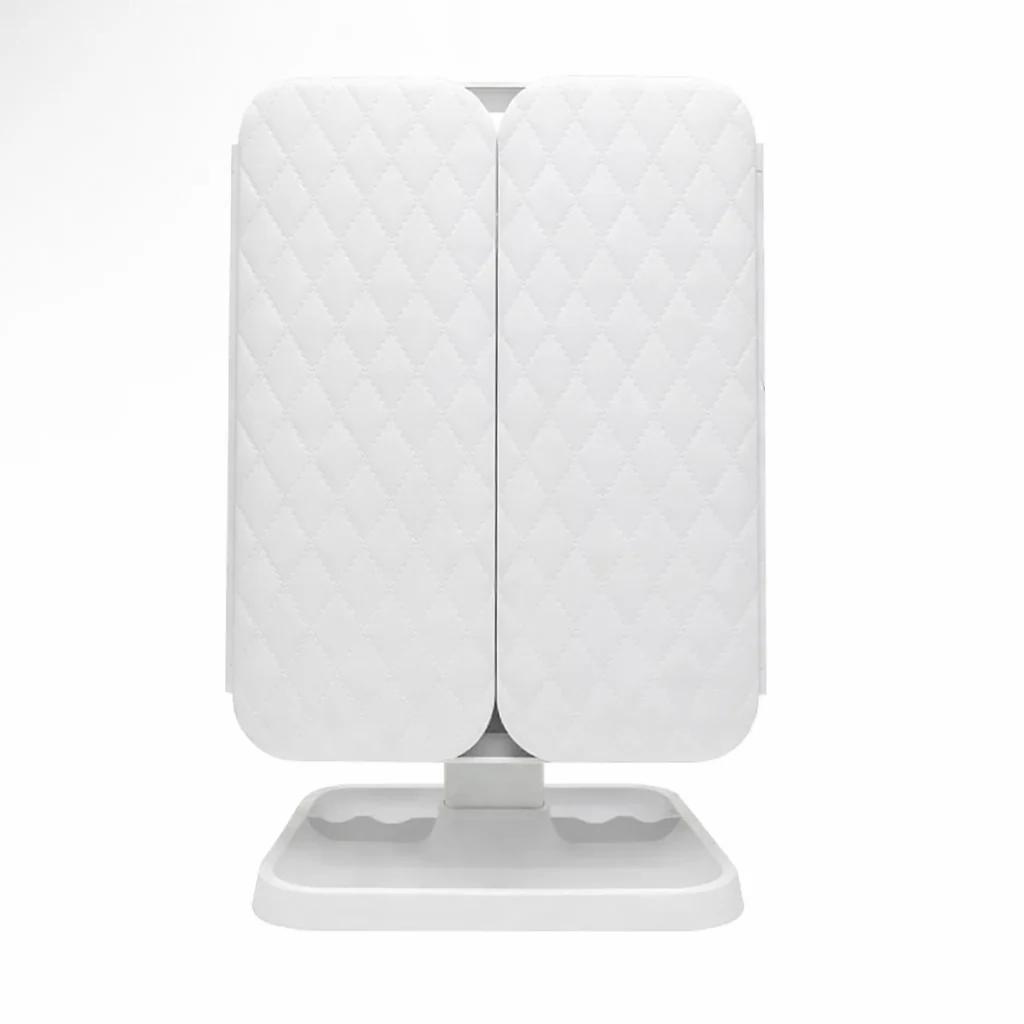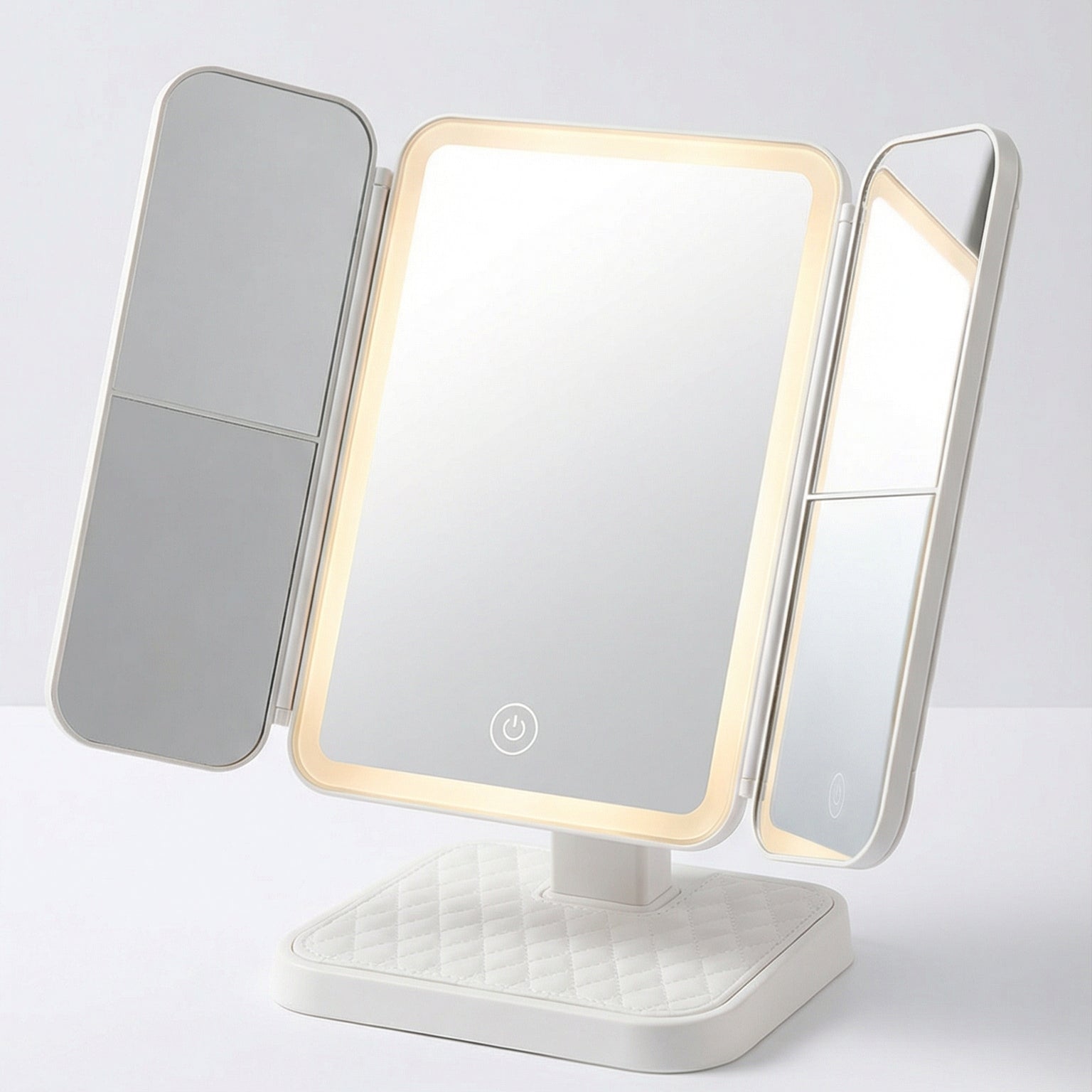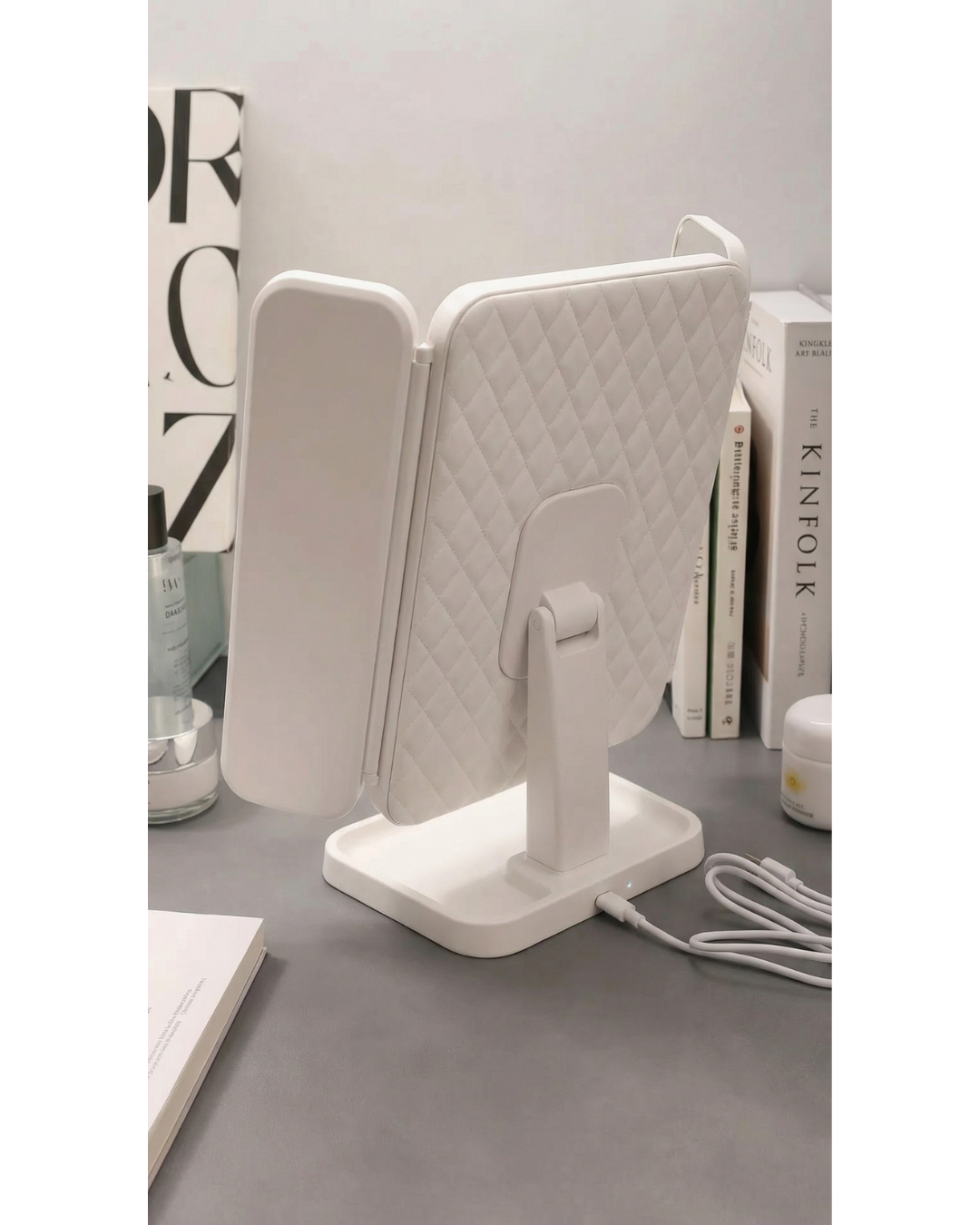 Üç kanatlı yapısı sayesinde ayna tamamen içe doğru katlanabilir. Katlandığında oldukça ince bir defter formuna bürünür, bu da hem masanızda yer tasarrufu sağlar hem de aynanın cam yüzeylerini çizilmelere ve toza karşı korur.